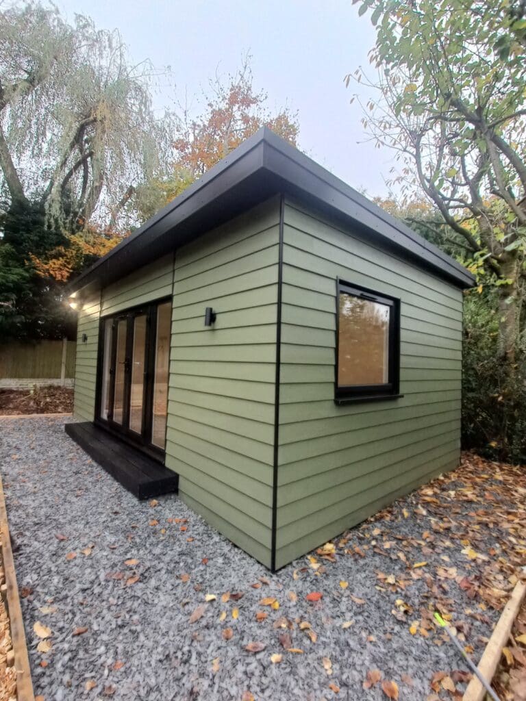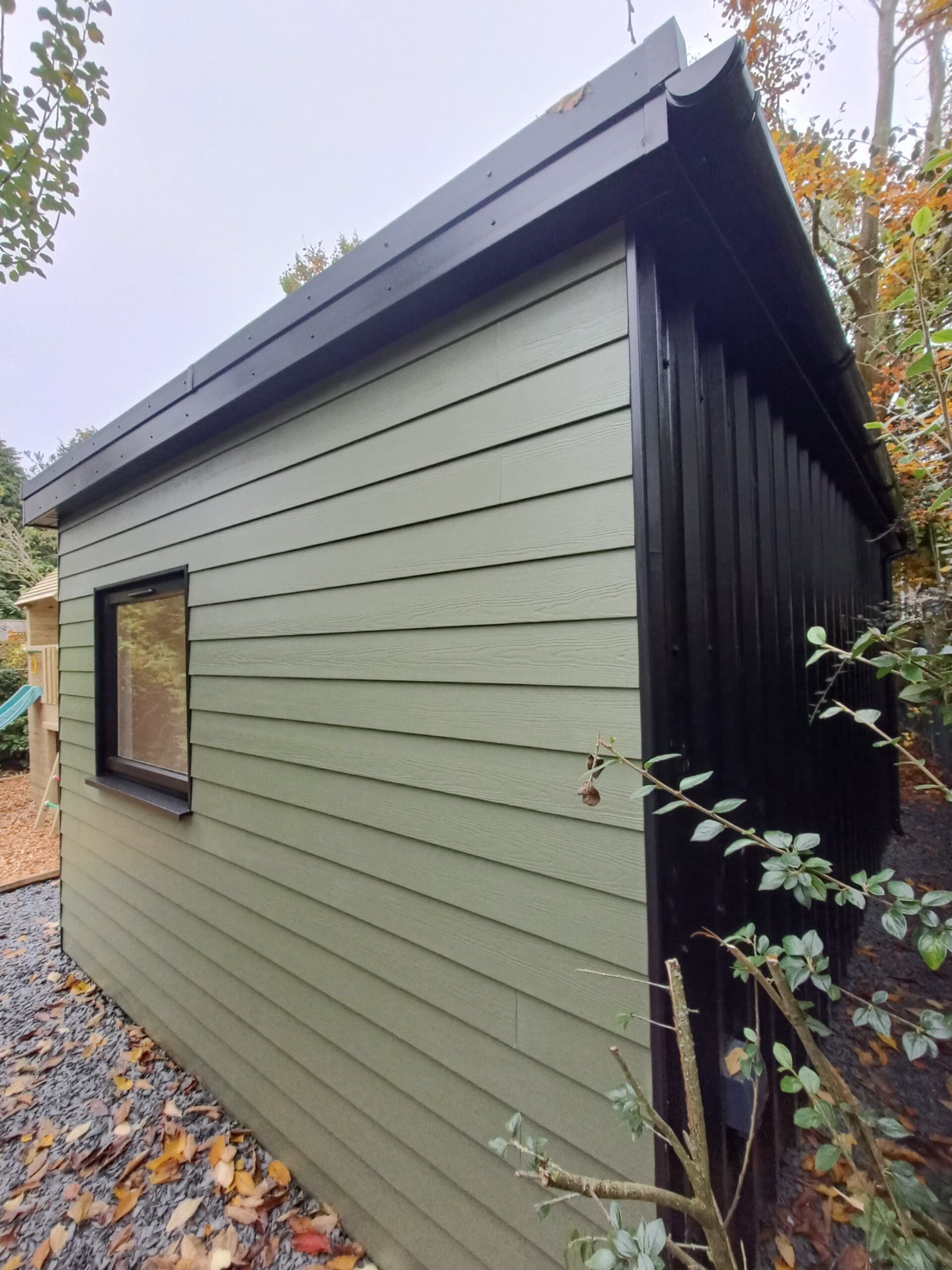 The finished garden room emerged in a stunning Hardie green ‘Mountain sage’ – a colour rapidly becoming a signature choice among our clients. Nestled perfectly in the corner of their garden, the space not only met but exceeded the family’s expectations. Recognizing the potential for additional improvements, Amy and Rez also requested a play area and retaining wall, which we were delighted to incorporate.