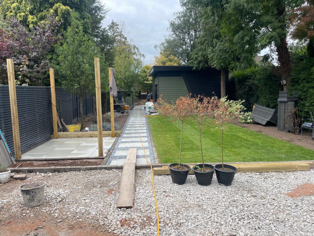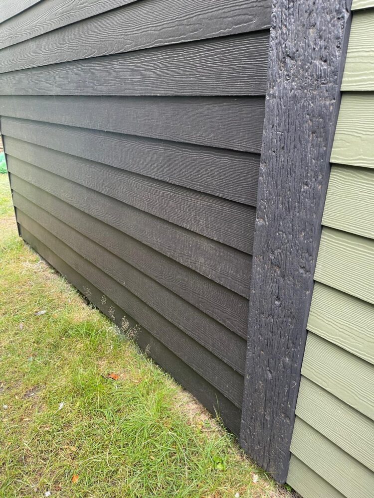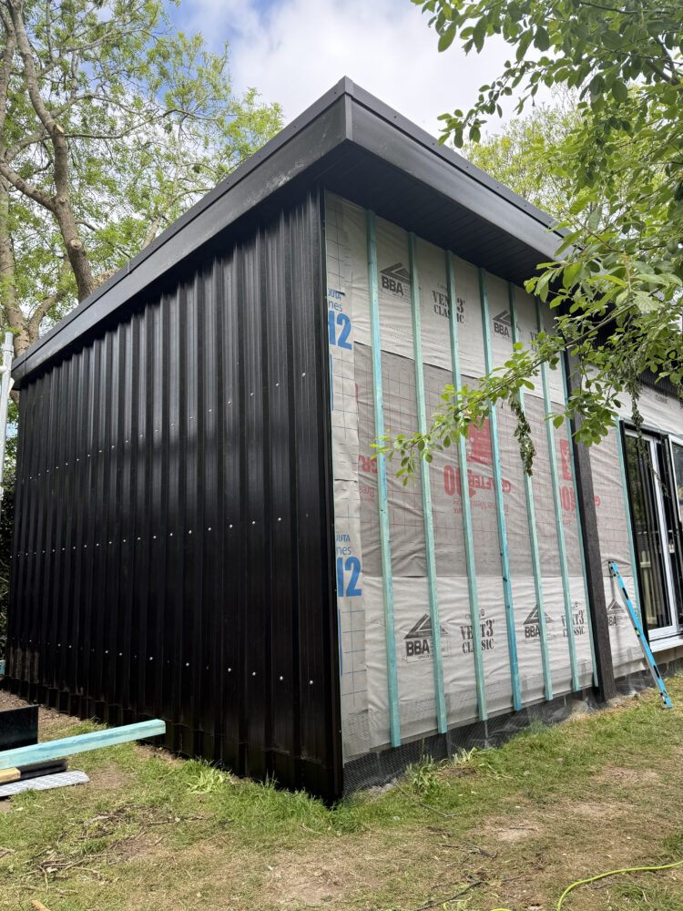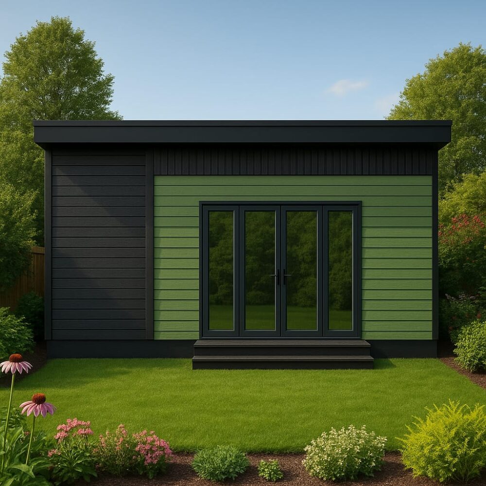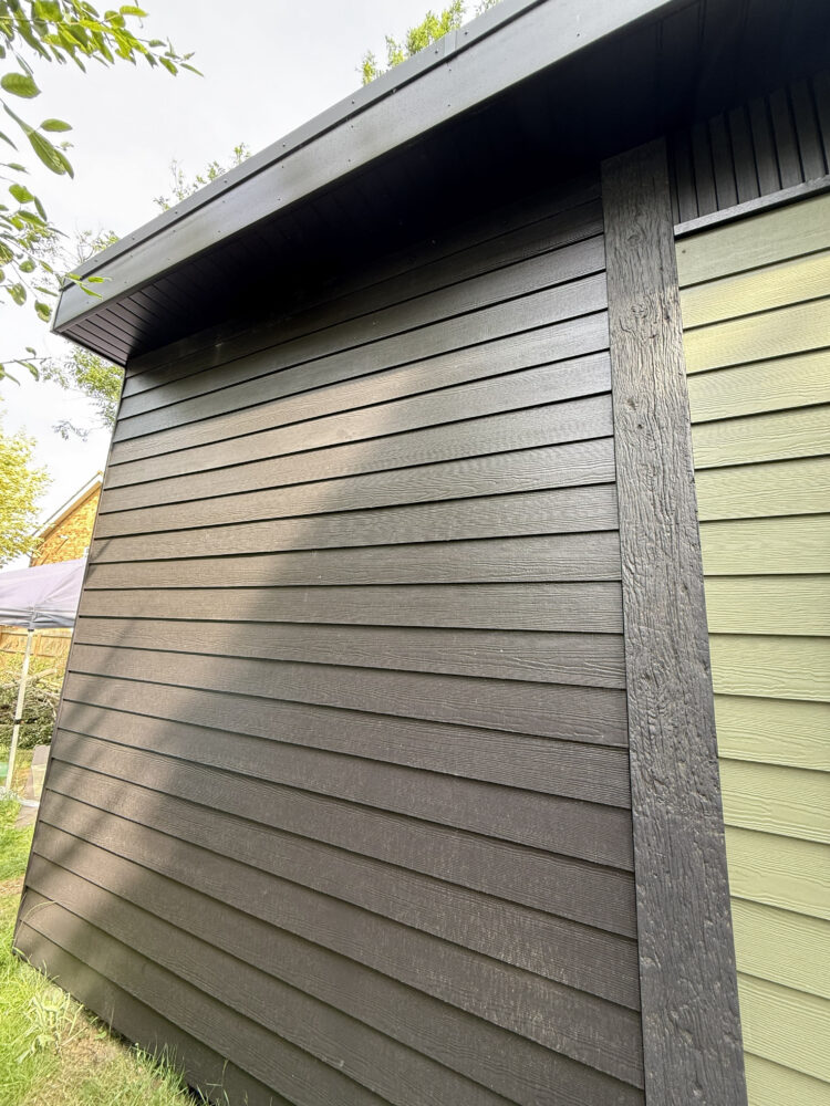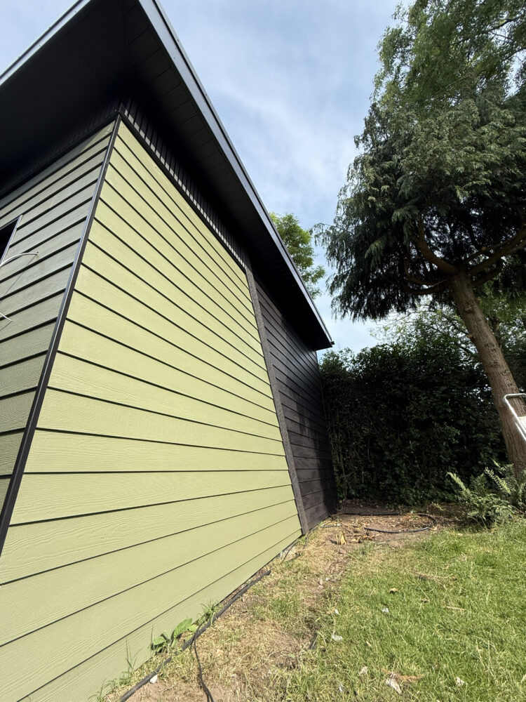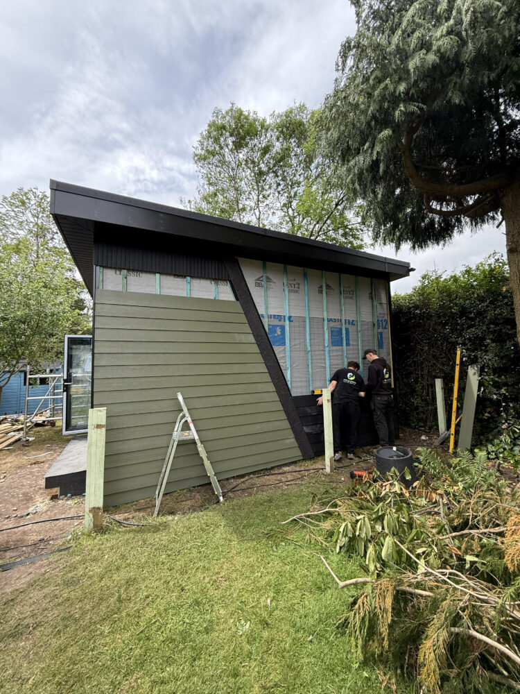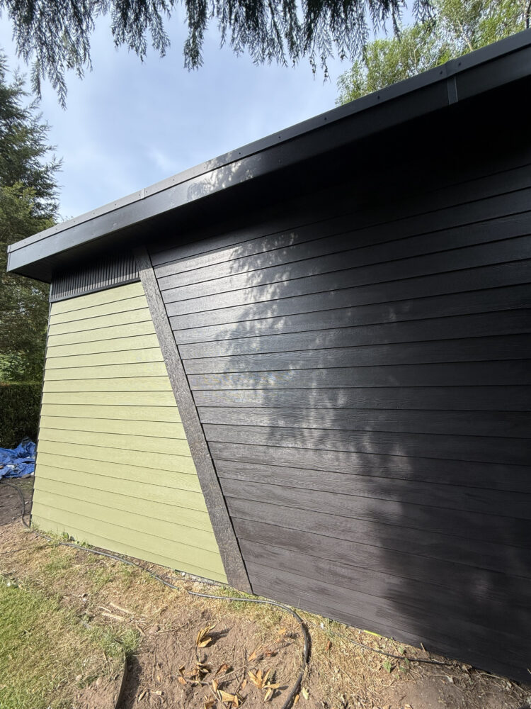 Because Mark’s garden offered a clear view of the building, we placed special emphasis on its external aesthetic. After several design iterations, we settled on a striking combination of charcoal and green cladding — the green chosen to subtly echo the tones of a golf course. A mix of slatted composite cladding and premium Millboard detailing gave the room a refined, contemporary look, with Millboard also forming a smart decked step at the entrance.