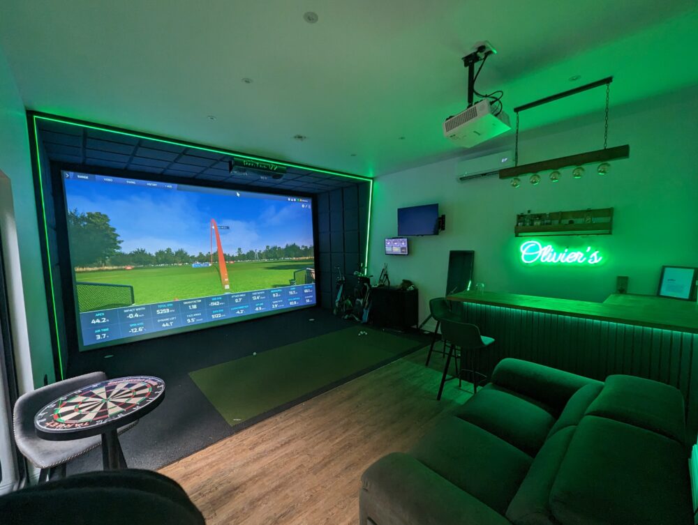 Inside, we enhanced the simulator bay with acoustic wall panels and introduced a sleek chamfered lighting detail featuring colour-changing LEDs — allowing the atmosphere to shift seamlessly between focused practice sessions and relaxed social evenings.